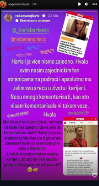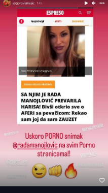 Поранешниот учесник во шоуто „Парови“, Дарио Шогоровиќ ѝ се закани на пејачката Рада Манојловиќ дека ќе објави едно од нејзините домашни видеа. Вети дека истото ќе го објавел на сајт за возрасни. Претходно ја обвини за раскинувањето со Харис Берковиќ.