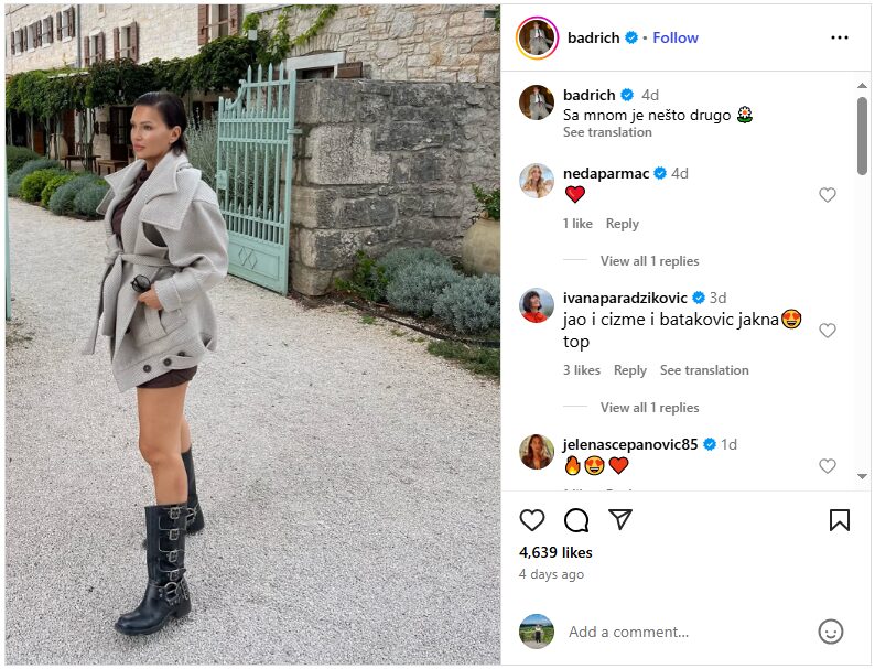 „Прекрасна“, „Модна икона“, „Ми се допаѓаш ти и облеката“, „Изгледаш совршено“, „Чизмите се прекрасни“, беа некои од коментарите под објавата.