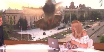 Додека водителката Бојана Ристивојевиќ разговараше со метеорологот Недељко Тодоровиќ, гулаб влета во кадарот на видео бимот во позадина.