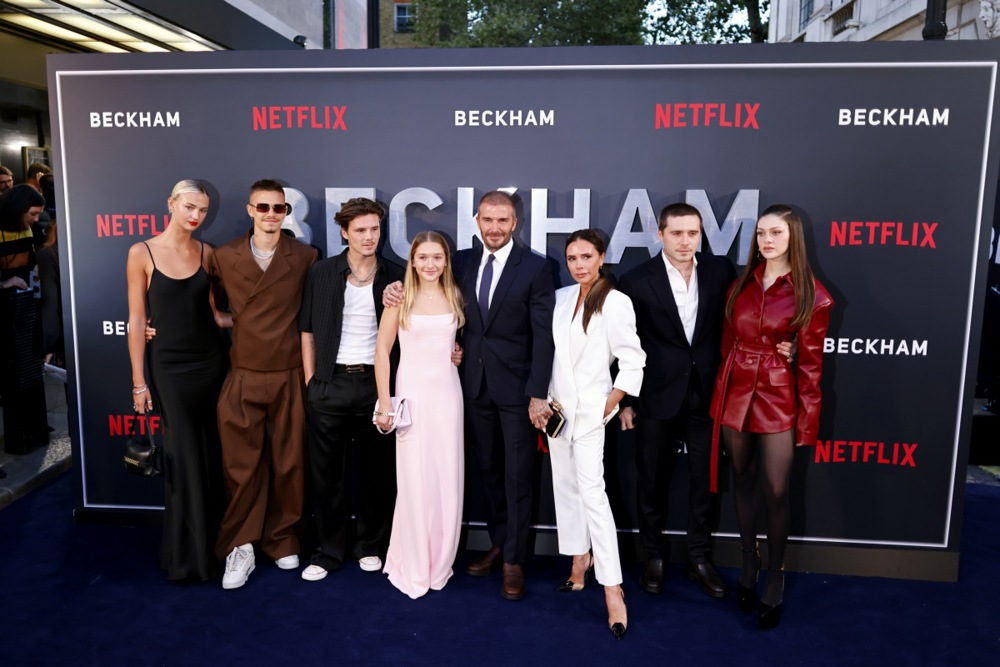 epaselect epa10897781 (L-R) Mia Regan, Romeo Beckham, Cruz Beckham, Harper Beckham, David Beckham, Victoria Beckham, Brooklyn Peltz Beckham, and Nicola Peltz Beckham attend the premiere of ‘Beckham’ at the Curzon Mayfair, London, Britain, 03 October 2023. The four-part documentary series launches on Netflix on 04 October 2023. EPA/Tolga Akmen