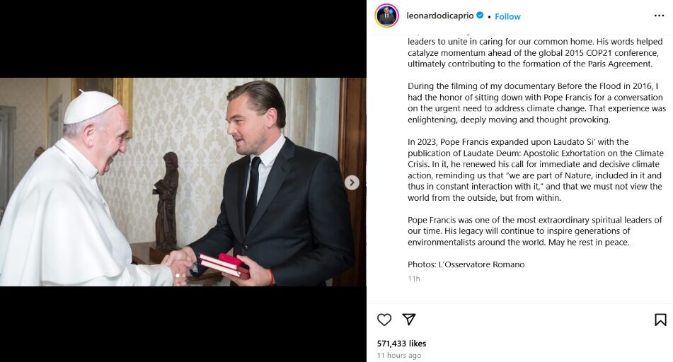 Ди Каприо (50) сподели фотографии од себе и папата Франциско на социјалните мрежи со порака: „Папата Франциско беше лидер кој донесе големи промени – не само за Католичката црква, туку и за еколошките реформи и еколошкиот активизам. Тој покажа длабока и непоколеблива посветеност на грижата за животната средина, особено преку неговата историска енциклика „Лаудато Си“ од 2015 година.