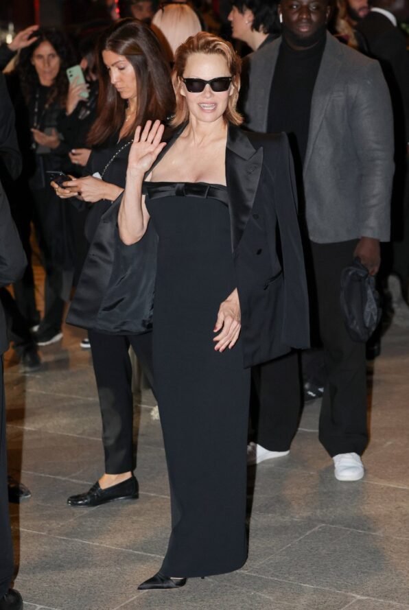 Памела присуствуваше на ревијата на Том Форд и за таа пригода блескаше во долг црн фустан со набори на градите. Црни чевли и црно сако придонесоа на нејзината елеганција, а очилата во иста боја ја правеа уште помистериозна.
