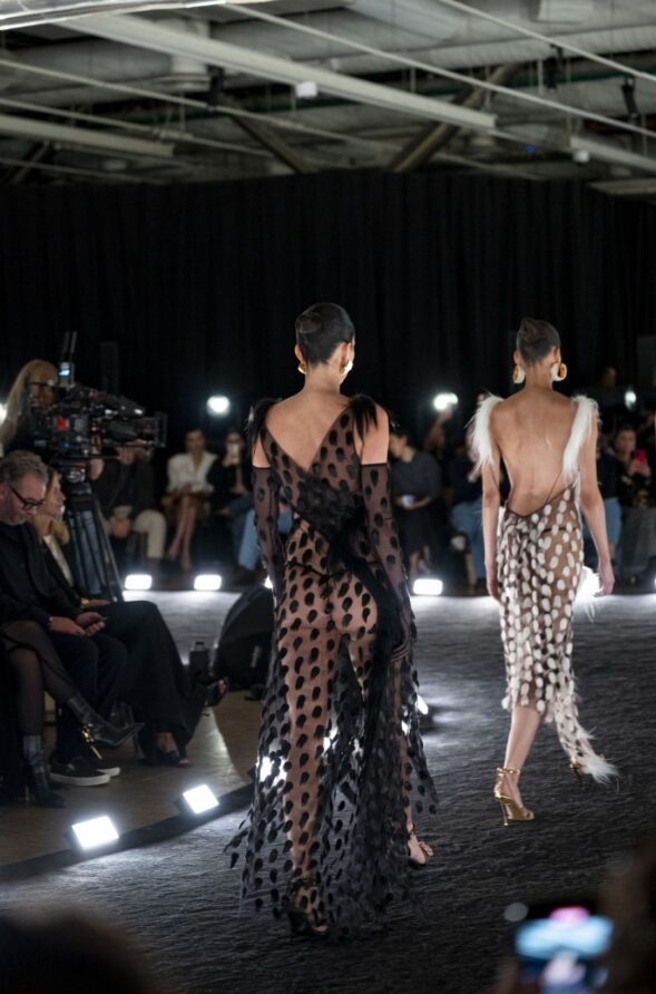 На тенките прерамки имаше пердуви, а метални сандали со високи потпетици ја заокружуваа нејзината „провокативна елеганција“.