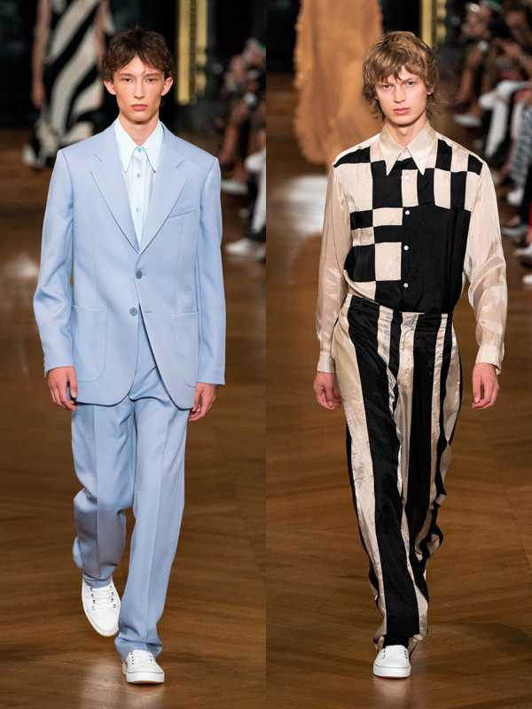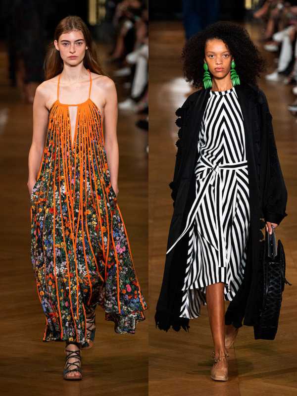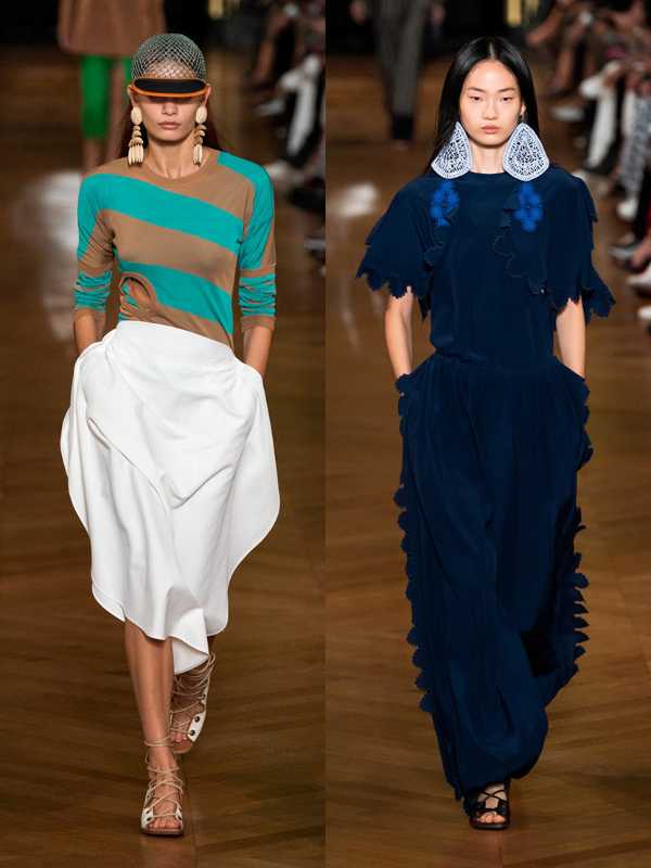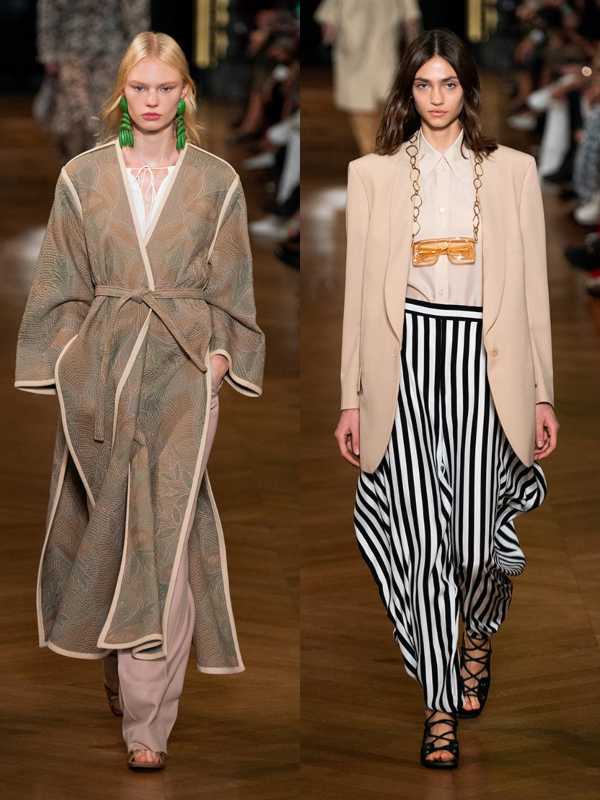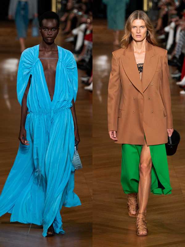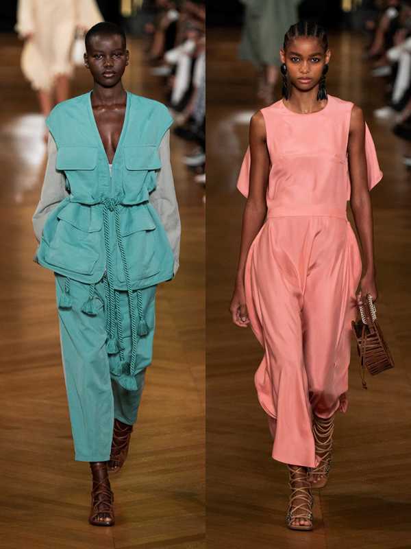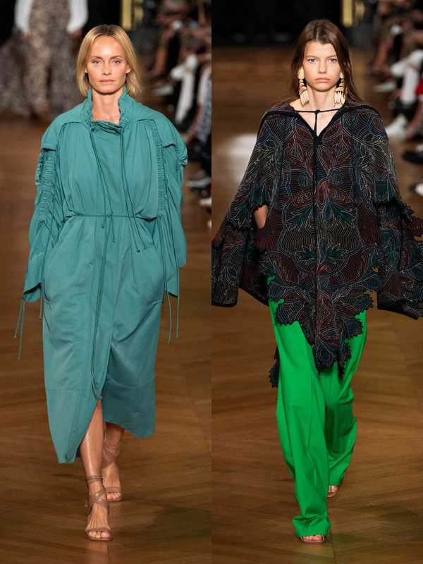 Лежерни силуети, нагласок на струкот, широки рамена, нијанси на зелена и сина.