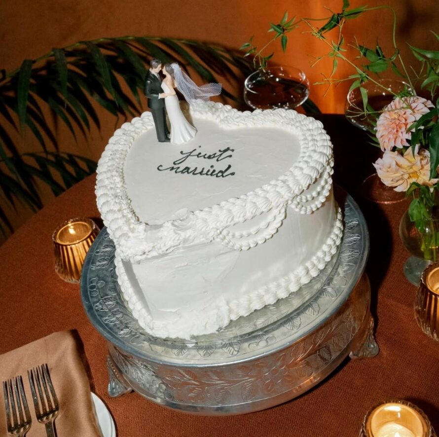 На фотографиите беше вклучена и свадбената торта во облик на срце на која пишуваше „тукушто венчани“ и фигурини на младенците. Самата церемонија се одржа под цветен лак во голем бел шатор, додека приемот беше осветлен со свеќи. Аранжмани од далии ги красеа масите, а кадифените столчиња во боја на ‘рѓа додадоа есенски допир.