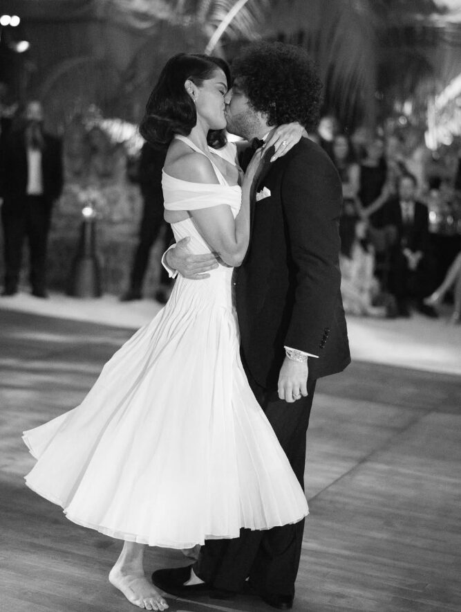 На една од фотографиите, 33-годишната Гомез го бакнува својот сопруг на подиумот за танцување, облечена во елегантен бел фустан инспириран од винтиџ стил, со деколте во форма на срце. Објавата откри дека пејачката носела три различни креации за време на нејзиниот посебен ден, сите потпишани од познатиот дизајнер Ралф Лорен.