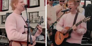 Ширан (34) свиреше на акустична гитара пред железничката станица Кингс Крос во петокот, облечен во впечатлива розова маица. Тој ја изведе новата песна Азизам, како и хитовите Perfect, Bad Habits и Shivers.