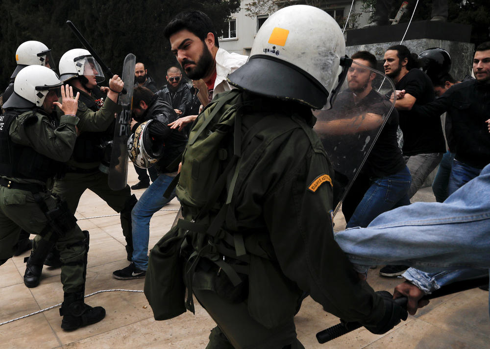 Students who tried to bring down Harry Truman’s statue in Athens, are beaten by police during an anti-war protest. #Greece #Syria pic.twitter.com/k7xFgyKf9v