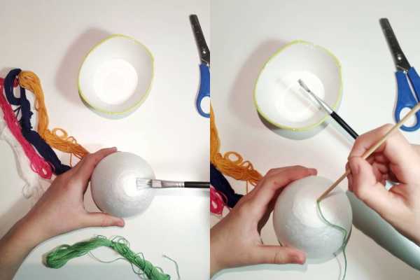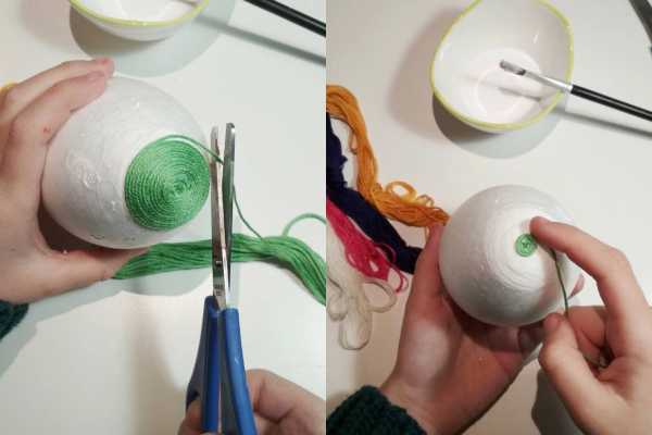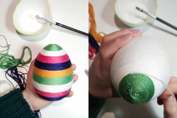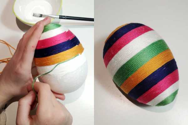 Врвот на јајцето го мачкаме со лепак. Правиме со четкичката мала дупка и го туркаме во него конецот, а потоа почнуваме да го обвиткуваме јајцето полека и темелно, внимателно конецот да не се повлече. По лепењето на конецот на која било фиксна ширина, ја менуваме бојата, лепејќи конец на крајот од претходната боја. Потоа мачкаме со лепак и продолжуваме со обвиткување на конецот до крајот на јајцето. Чекаме лепакот да се исуши и јајцето е спремно.