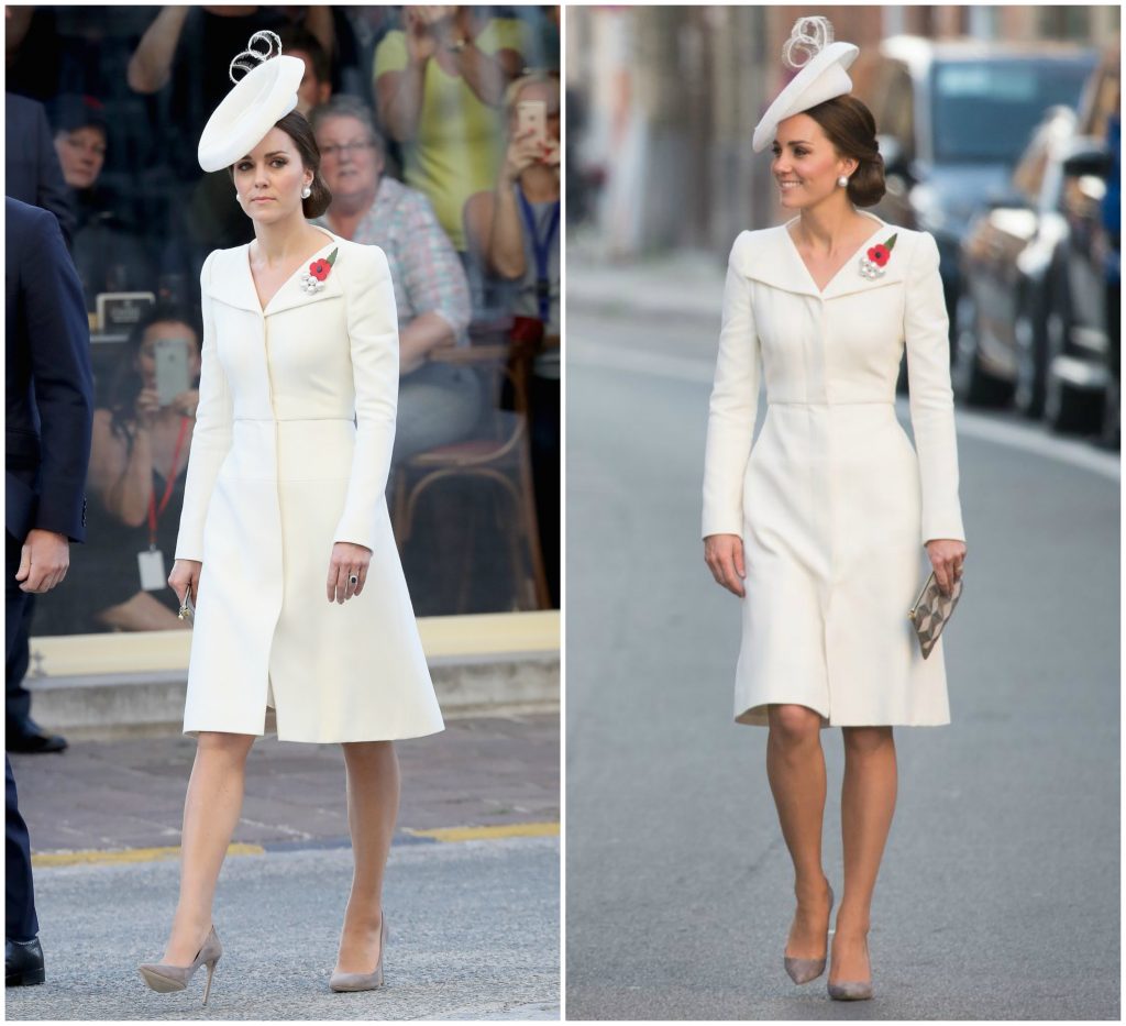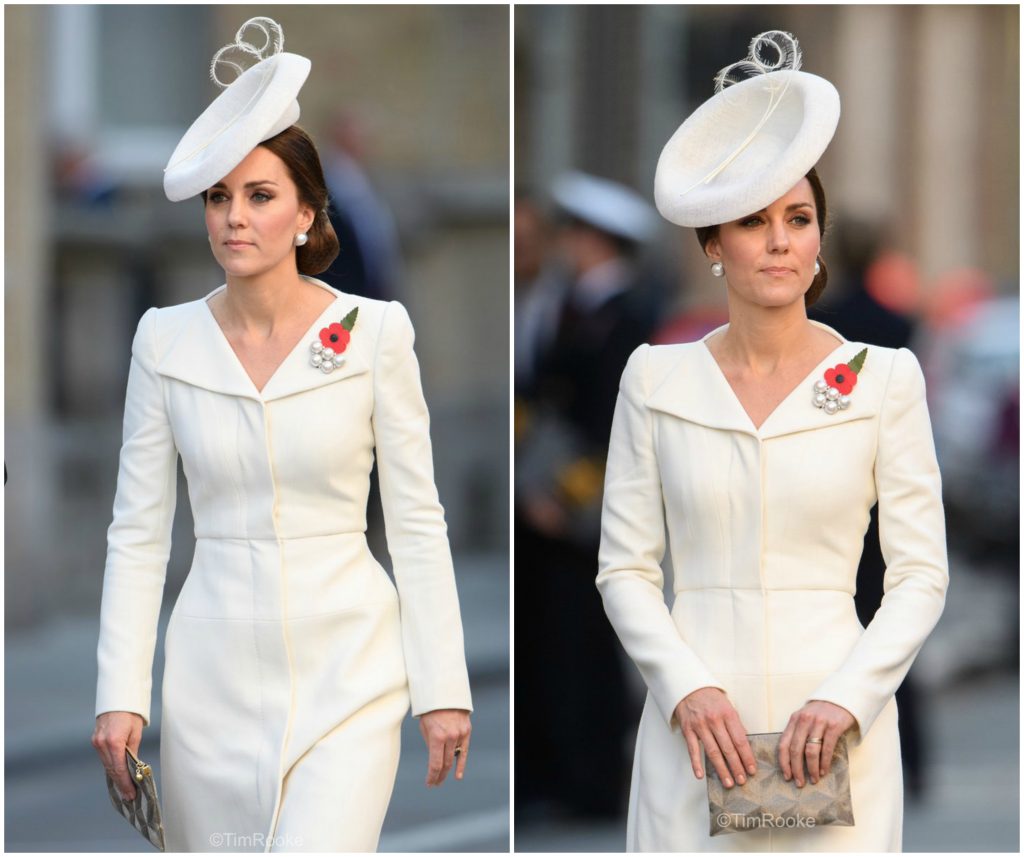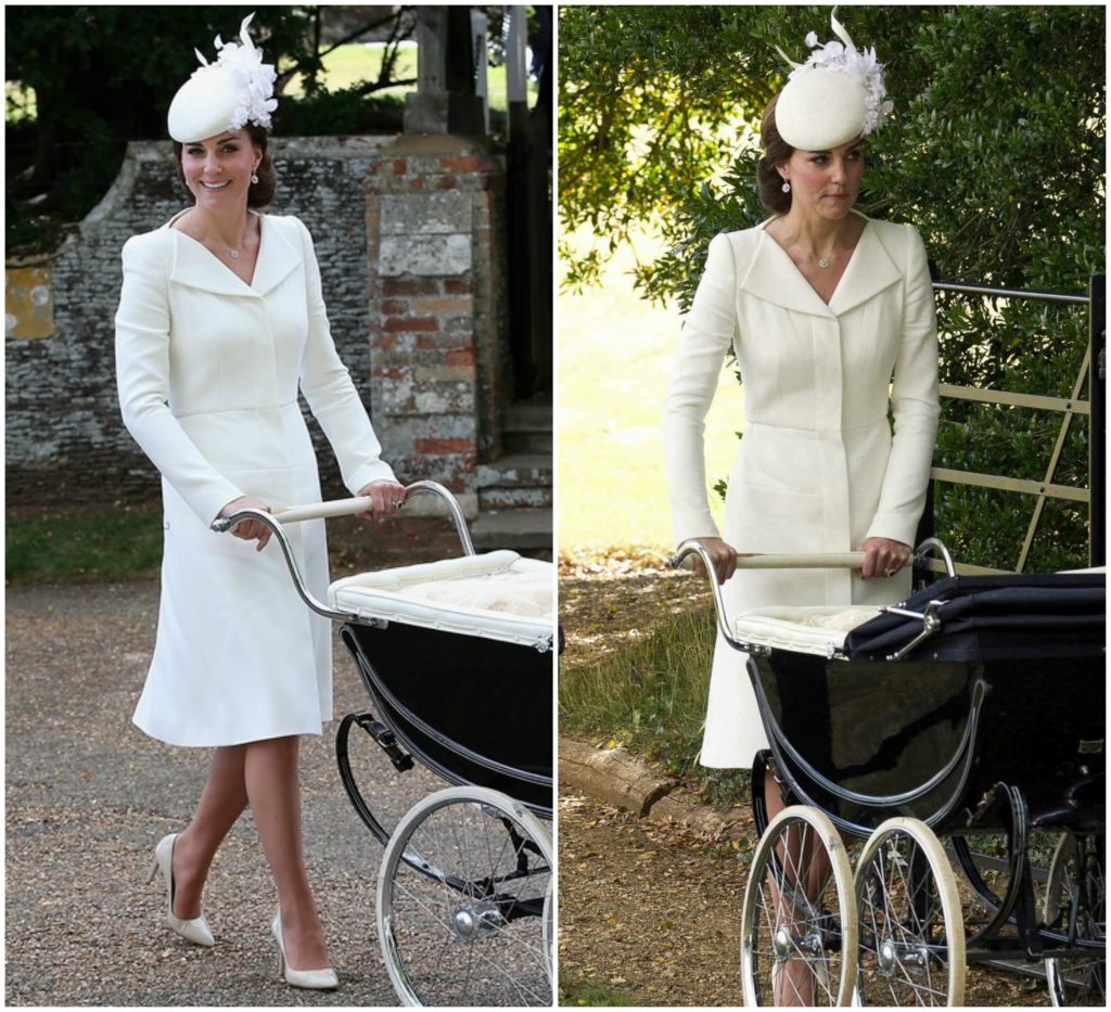 Таа го носеше познатиот елегантен бел фустан од модната куќа Alexander McQueen кој исто така го носеше на крштевката на принцезата Шарлот во идентична комбинација со бел шешир но овој пат со сиви потпетици.
