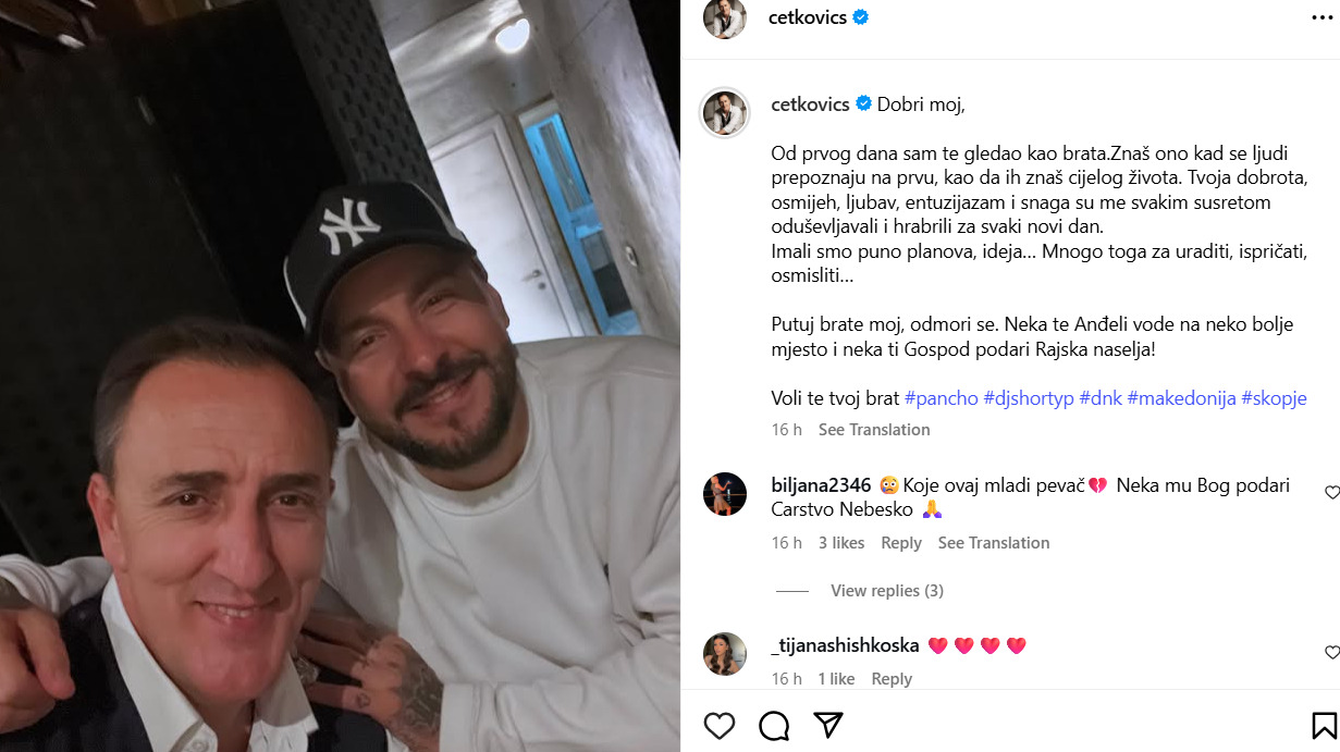 „Од првиот ден те гледав како брат. Знаеш кога луѓето се препознаваат на прв поглед, како да ги познаваш цел живот. Твојата љубезност, насмевка, љубов, ентузијазам и сила ме воодушевуваа на секоја средба и ме охрабруваа за секој нов ден“, напиша црногорскоот пејач, Сергеј Четковиќ на социјалните мрежи.