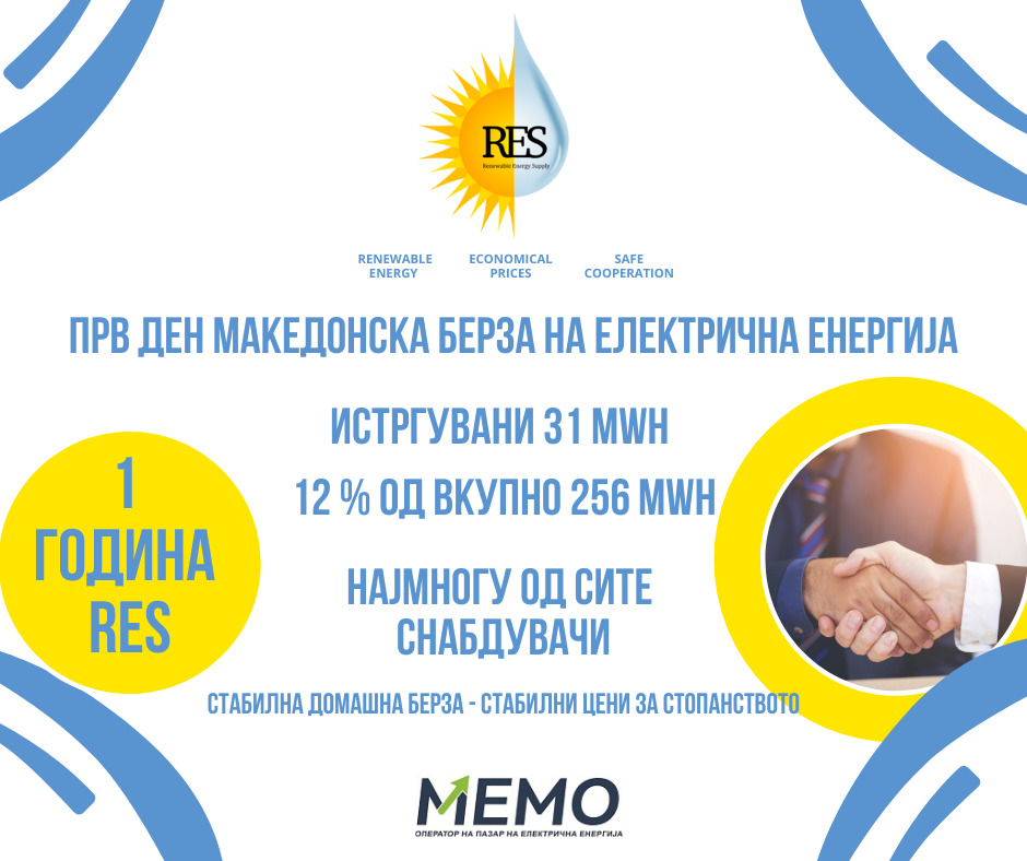 Компанијата РЕС (Renewable Energy Supply),  вчера, на првиот ден од работењето на македонската берза за електрична енергија, истргува најголемо количество енергија од сите снабдувачи, односно 31 мегават часови, или 12% од вкупното количество од 256 мегават часови, истргувани од страна на 20 компании кои вчера учествуваа на берзата.