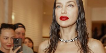 Имено, Ирина носеше тесна црна тоалета со мотиви од сончоглед кои се растегнуваа по целата должина на фустанот. Својот стајлинг го комплетираше со проѕирни ракавици и впечатлива шминка.