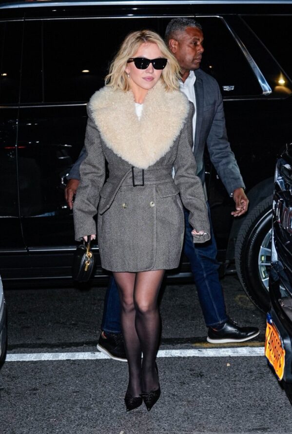 Од друга страна, Сидни Свини постигна исклучително гламурозен изглед со капут до колена со преголема крзнена јака со ремен.