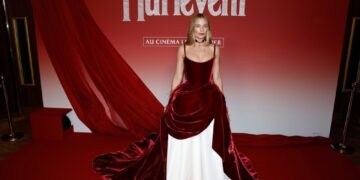 Таа прошета по црвениот тепих во винтиџ креација од брендот Шанел. Станува збор за впечатлив фустан од корсет направен од црвен кадифе со класичен крој и долг дел што се влече.
