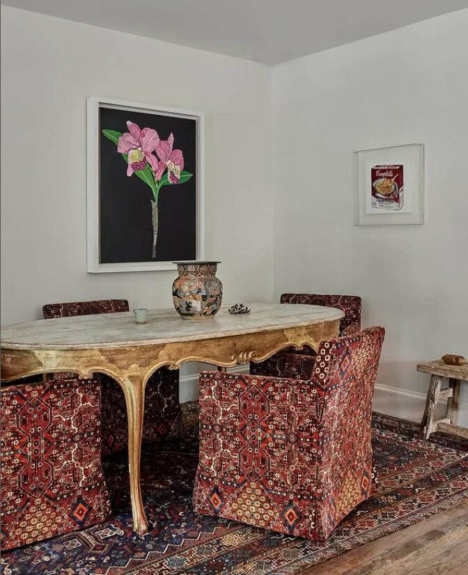 Иако просторот на Бени е уникатно убав, успехот на оваа комбинација на шари во неговата трпезарија јасно покажува зошто овој стил станува сè попопуларен тренд во ентериерите за 2026 година. Овој изглед е особено импресивен во трпезариите.