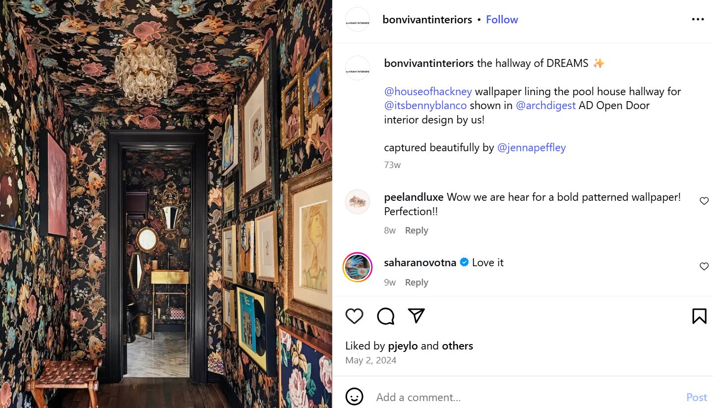 „Слоевитото е клучно за создавање удобен, пријатен простор. Кога се комбинираат богати дезени на тапети, мебел или чаршафи, добивате смел, слоевит изглед кој се чувствува неверојатно топол и пријатен.“