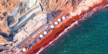 До Црвената плажа, до која претходно можеше да се стигне од археолошкиот локалитет Акротири, сега може да се пристапи само со брод.