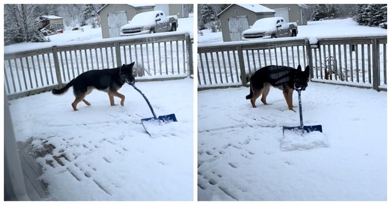 На видеото германскиот овчар како игра во дворот и ја турка лопатата за снег, како да се обидува да го исчисти снегот.