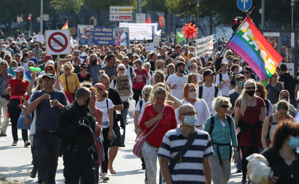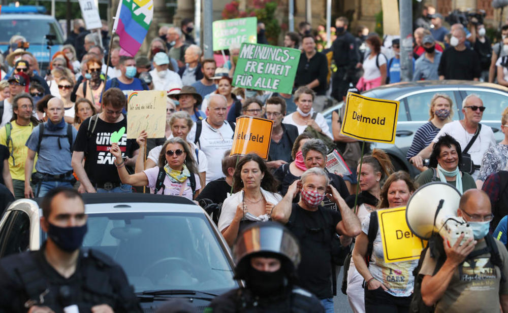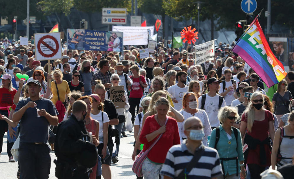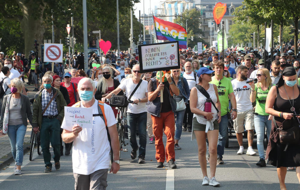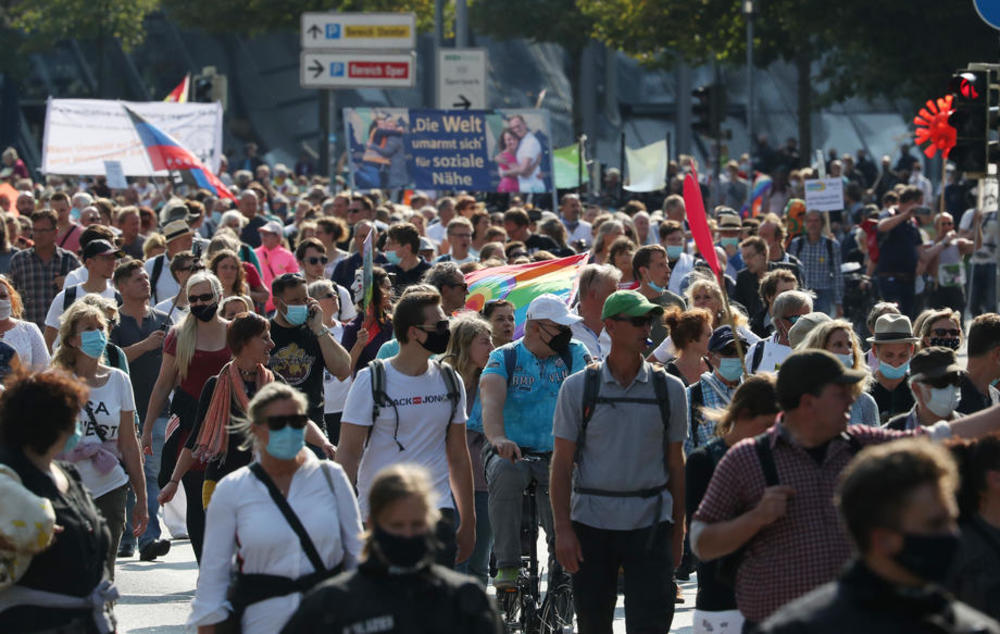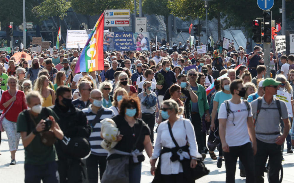 Во Германија се одржуваат масовни протести против владините мерки за заштита од коронавирусот. Многумина сметаат дека станува збор за лажна пандемија и ја обвинија владата за намерно ширење на страв од лажна пандемија и лишење на човековите права.